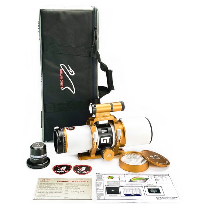 In addition to the Gran Turismo 81, this package also includes the William Optics Flat6AIII field flattener/reducer which provides 0.8x reduction, as well as the William Optics 32 mm UniGuide Finder Scope with a focal length of 120 mm and a focal ratio of f/3.75, which mounts onto the handle of the GT81.